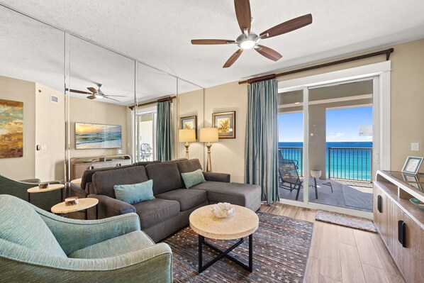 Le salon est beau et grand. Et, il a un super look qui dit "je suis à la plage." C’est vraiment très coloré et amusant, et on tire le meilleur parti de la pièce dans chaque pièce. Il ya beaucoup d’espace pour tous vos trucs de plage, mais ce n’est pas pour cette raison que vous choisirez cet appartement. Il y a de superbes vues. Clair et simple.