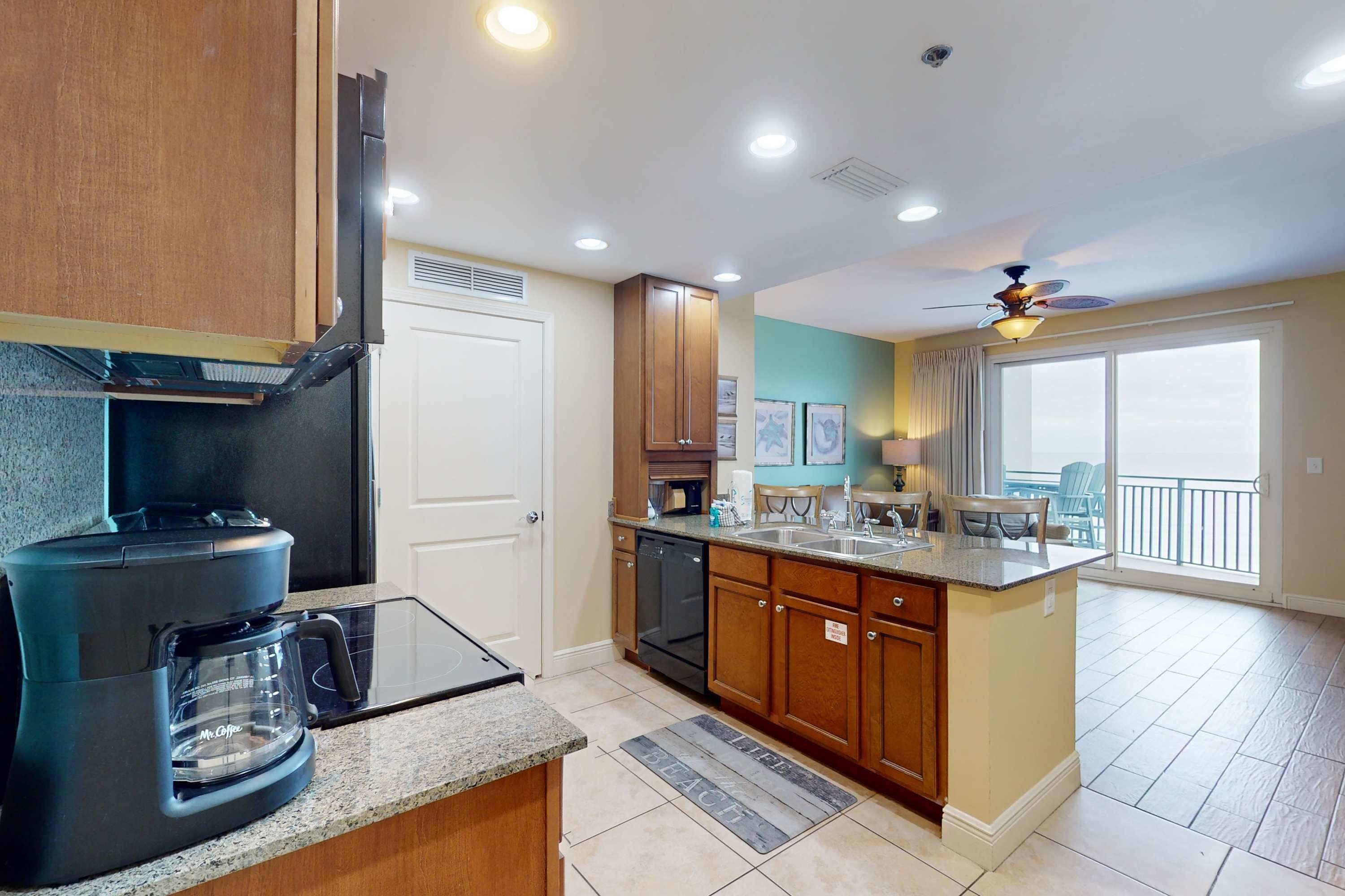 After a family-fun day at the beach, keep the sand out of the condo by storing both the provided beach toys and chairs and any of your beach items in the storage closet conveniently located just outside the condo. Relax on your large private west-facing corner balcony in the comfortable polywood table and chairs and bistro set as you watch the most amazing sunsets in the world. Look for dolphins, stingrays and turtles as you cook your family's dinner on the balcony's private electric grill. If you don't want to cook, no worries - take a short walk to the famous Dusty's Oyster Bar or Pier Park.
