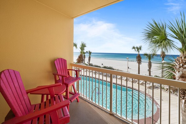 Being on the second floor was great for the kids going up and down from the pool and beach. There were plenty of beach toys and chairs in the laundry room. Pool was heated and the beach was easy to access and clean. Pier and Pier Park (restaurants) were within walking distance. Parking is in the garage across (busy) Front Beach Rd and is $20 per vehicle. There is a loading/unloading area by the condos, so the kids don't have to cross the busy street. Carts for luggage are in the parking garage pedway (inconvenient, but not a big deal).