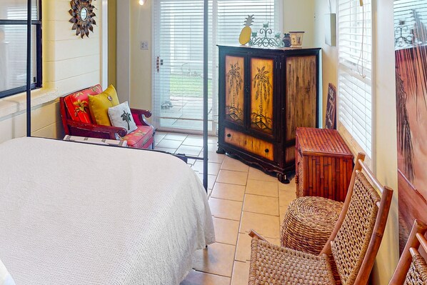 Bright, colorful, and cozy, this charming retreat features a full kitchen with everything you need to prepare quick beach snacks or full-course dinners. Dine at the intimate breakfast bar or the pub-height table, and then relax on the sofa bed while you stream all your favorite TV channels into the evening using your own accounts.