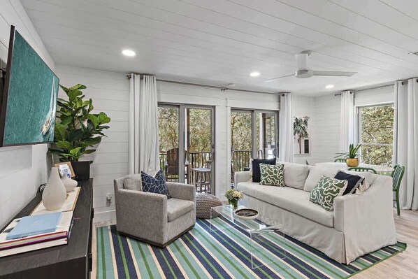 Upon entering, you'll find yourself in a welcoming open-concept living area that combines the living room, dining space, and kitchen. This area is ideal for relaxing and feeling right at home. With cable TV, high-speed Wi-Fi, and a fully-equipped kitchen, you'll have all the amenities you need. Start your day with a fresh cup of coffee and step out onto the balcony through the sliding glass doors, where you can enjoy views of the community pool and lush landscaping, with the gulf in the distance.