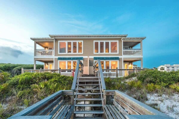 A propane grill and ample outdoor seating are on the balcony leading to the beach boardwalk. Guests can also enjoy complimentary beach gear!