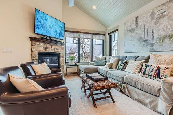 Cozy Living Room with Fireplace: After a day on the slopes, relax in the inviting living room by the fire—perfect for gathering and unwinding.