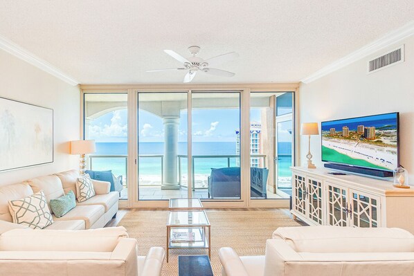 Step inside and experience an open floor plan filled with natural light through floor-to-ceiling windows and sliding glass doors, creating a seamless connection between indoor elegance and outdoor serenity. The living room and primary bedroom both open onto the spacious balcony, making the water views an ever-present backdrop to your stay.