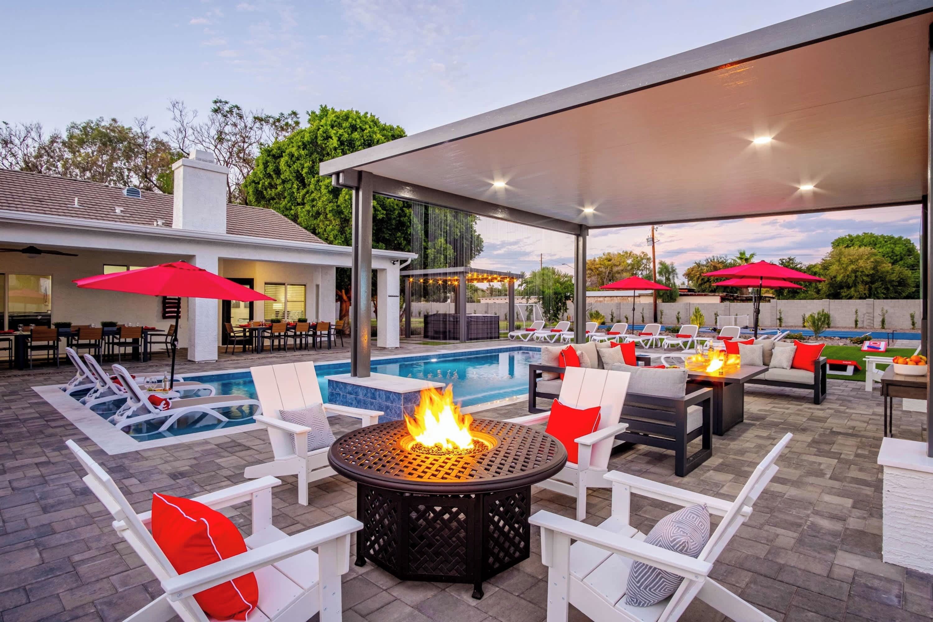Rendez votre séjour loin de chez vous amusant et paisible avec cette belle oasis du désert à Mesa. Cette maison repose sur 1 acre avec une immense piscine chauffée de 1100 pieds carrés (option 150 $ par jour supplémentaire pour chauffer. Nécessaire habituellement de novembre à avril), glissade d’eau en pierre, cascade, balançoire en corde et douche extérieure sont parfaits pour votre escapade estivale. Asseyez-vous sur le grand patio couvert et écoutez la cascade tranquille ou profitez de l'arrière de la propriété où il y a beaucoup d'herbe pour courir et jouer. L'intérieur de cette maison est complètement réaménagé avec la cuisine de rêve du chef, du granit de niveau 4 et un réfrigérateur et un congélateur surdimensionnés. Le salon principal a de nouveaux planchers de bois franc, tandis que les chambres ont un tapis. Cette maison a 6 chambres à coucher, 3. 5 salles de bains et dormira 15 confortablement. Belle chambre principale et salle de bain avec mur de granit, 3 pommes de douche, baignoire sur pattes et une vue imprenable sur la cour à travers les portes fenêtres. Espace de vie supplémentaire au sous-sol avec télévision. Cette maison dispose également d'une suite pour invités avec chambre à coucher, salle de bain et salon avec télévision. Cette maison est à distance de marche des boutiques et restaurants incroyables, y compris: Ra Sushi, Buca Di Beppo, Rodizio Grill, Anthropologie, Barnes & Noble et boutiques À 3 minutes de l'autoroute et à 15 minutes de l'aéroport Sky Harbor. Tour vidéo:
