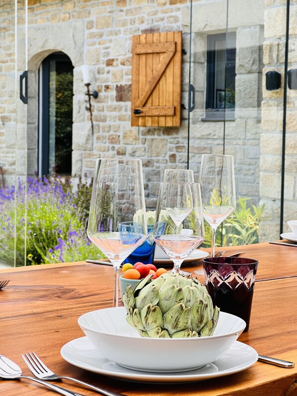 Luxueuse villa cocooning CINQ étoiles directement sur la plage, grande et généreusement équipée, grande cuisine, espace bar privé avec réfrigérateur à vin, grand espace SPA (jacuzzi 5 personnes, sauna finlandais spacieux, espace transat avec vue imprenable sur la mer, piscine Kneipp) - généreusement luxueux avec tout le confort. La Villa Ty Arvorig est vraiment unique en son genre en termes d'équipements et de confort, elle a vraiment plus qu'une touche de luxe et a été classée cinq étoiles par l'Office français du tourisme - une distinction très rare dont nous sommes très fiers. En fait, votre cœur commence à s'ouvrir dès que vous entrez dans la belle maison de vacances, de bon goût, confortable et luxueuse - cette villa est notre cœur cocooning, tout notre portefeuille de maisons de vacances - spacieuses, près de 200 m² pour seulement 6 personnes. Un équipement de grande qualité, avec tout ce que vous pourriez souhaiter, votre propre bar, un jardin d'hiver entièrement vitré juste en face de votre propre espace bien-être avec un grand sauna, une piscine Kneipp, votre propre douche et toilettes SPA et bien sûr un immense jacuzzi devant. . Les propriétaires ont mis tant de cœur dans la maison, par exemple tous les lits ont été fabriqués à la main spécialement pour Arvorig par un forgeron. Chaque chambre a sa propre salle de bain (2x en suite) et toilettes. Venez visiter "Ty Arvorig" - vous serez étonné de voir à quel point une maison de vacances 5 étoiles au bord de la mer peut être généreusement luxueuse et en même temps cocon-cosy.