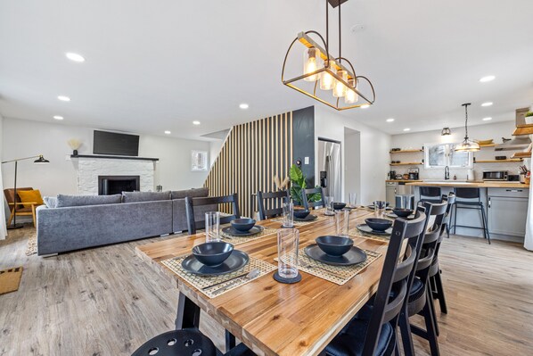 Boho-Scandinavian inspired home design with fully equipped kitchen with dishwasher, coffee station, microwave and full-size refrigerator.