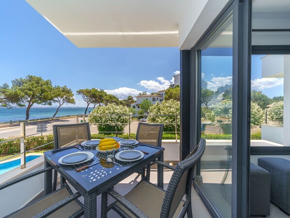 Belle petite résidence moderne, confortable "Oratge Beach Views". Dans la localité, à 900 m du centre de Port de Pollença, situation tranquille, ensoleillée, excellente situation: centrale mais tranquille, à 2.5 km de la forêt, à 10 m de la mer, à 10 m de la plage, route à traverser. En commun: jardin avec pelouse, piscine (8 x 4 m, profondeur 40 - 165 cm, disponibilité saisonnière: 01.Jan. - 31.Dec.). Douche extérieure. A usage privé: terrasse (6 m2). Infrastructures de la Maison: accès internet, Connexion WIFI, air-conditionné, lave-linge. Parking public couvert à 25 m, parking public possible dans la rue. Magasins 1.2 km, magasin d'alimentation 500 m, supermarché 600 m, restaurant 50 m, bar 100 m, boulangerie 1.5 km, zone piétonne 600 m, location de bicyclettes 900 m, biergarten 50 m, centre à 10 minutes à pieds, arrêt de bus 500 m, plage de sable 10 m, plage de galets 50 m. Port plaisance 1.7 km, marina 1.7 km, terrain de golf (18 trous) 9.8 km, tennis 2 km, chemins de randonnées pédestres depuis la maison 1.5 km, piste cyclable 1.5 km. Attractions à proximité: Pollença Pueblo 6.7 km, Far de Formentor 23 km, Ciudad Romana d'Alcúdia 7 km, Playa de Formentor 12 km, Cala Sant Vicenç 11.2 km, Mercado Local Miércoles 8-13h. Région de randonnées: Cala Boquer, Atalaya d'Alcúdia, Serra de Tramuntana. Veuillez noter: sans ascenseur. Bien convenant à 2 adultes. Aéroport 66 km de la maison. Environnement très sensible au bruit. Silence et bonne tenue exigés.