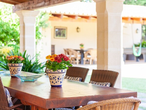 La propriété, située près du golf de Pollença, se distingue par son magnifique jardin et sa situation privilégiée sur la côte nord de Majorque.