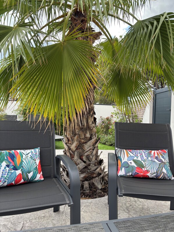 A l'extérieur, profitez de la terrasse aménagée avec salon de jardin, barbecue, transats et parasol pour des moments de détente en plein air. La piscine privée ( 3 x 3 ) est idéale pour se rafraîchir et profiter du soleil en toute intimité. Seulement 5 mn de la plage.