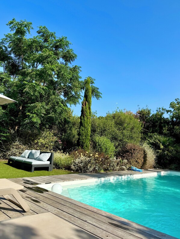 En quelques mots, c'est une villa de plain pied joliment décorée, donnant sur un jardin paysager autour d'une piscine chauffée avec bains de soleil, parasols et salon de jardin; à l'abri des regards, on se croirait au milieu du maquis. .