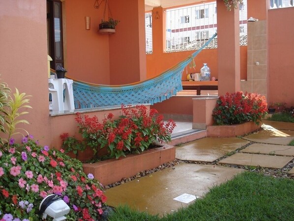 Belle maison, avec 2 chambres et 1 suite, salon, petite pièce, cuisine, cuisine. salle de bains, grande cuisine, balcons autour de la maison et jardin décoré. Au total, deux hamacs sont disponibles pour votre acompte au retour de la plage.