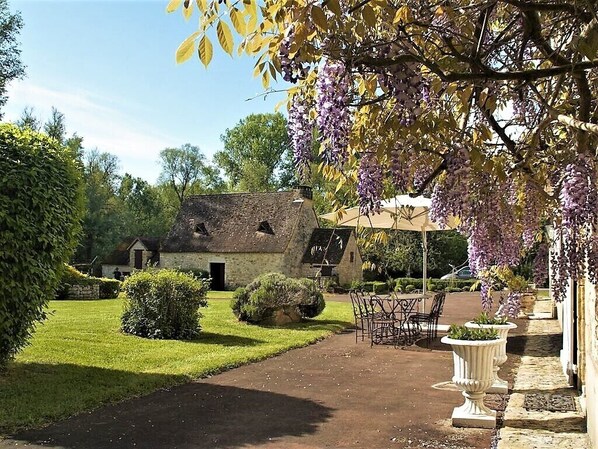 Bordé par la rivière Dordogne, le parc se compose de 8 hectares de pelouses, de bois et d'une noyer à explorer. Vous pourrez savourer un apéritif ou un repas en plein air sur la terrasse, équipée d'une table et de chaises. Un barbecue de qualité professionnelle est également disponible, parfait pour les soirées d'été!