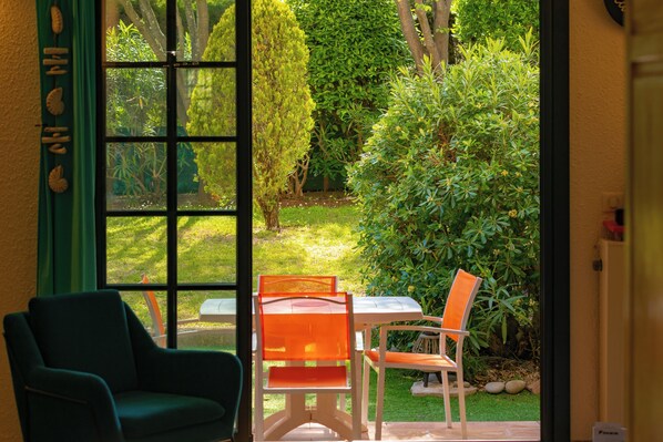 Bel appartement de 40m2 au coeur d'une pinède, situé au rez-de-jardin avec une terrasse de 19m2 exposé plein sud, dans une résidence provençale de standing sécurisée. A 150m de la plage, avec ses deux piscines à 50m (grande et piscine enfants) à l'accès sécurisé. Parking gratuit . Cette résidence vous charmera par son confort et son environnement calme et verdoyant, dans un quartier résidentiel. Sa terrasse est sans vis à vis, avec une belle vue sur un jardin paysagé. Climatisation fixe.