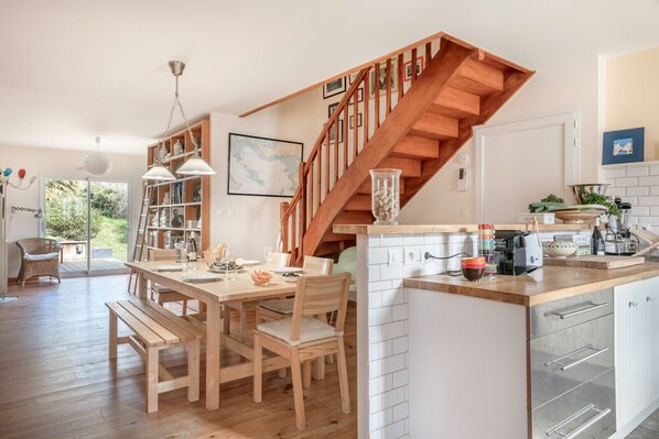 Maison de 120 m² meublée avec goût et totalement équipée à Sarzeau qui possède 3 chambres et peut accueillir jusqu'à 7 personnes. Elle dispose d'un jardin clôturé, d'une terrasse en bois de 35 m² avec mobilier de jardin, d'un accès Internet via Wi-Fi et deux télévisions, d'une cheminée, d'un fer à repasser et d'une place de parking en extérieur. La cuisine américaine est équipée d'un micro-ondes, d'un four et de plaques vitrocéramiques, d'un réfrigérateur, d'un congélateur, d'un lave-vaisselle, d'une cafetière, d'un grille-pain, d'une bouilloire et d'un presse-agrumes, d’un blender et d’un batteur/mixeur à main. Vous disposez également d'un lave-linge dans le garage. Vous trouverez aussi du matériel de puériculture à disposition : lit parapluie, chaise haute, baignoire bébé... Située dans une zone idéale pour les familles, et à proximité immédiate de la plage et des anciens marais salants, la location se trouve à :