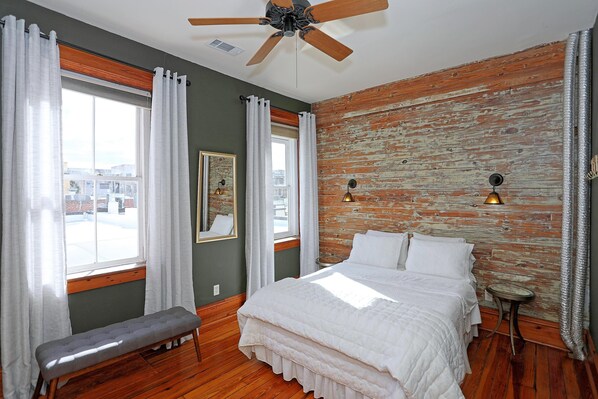 Up two flights of stairs, the Perch features windows on three sides offering a panoply of views. Northward, the living and dining areas look out across Broughton toward the river. Sipping coffee in the morning, don't be surprised to see a ship towering behind the low-slung historic skyline, moving slowly up river toward the Port of Savannah. Working at the desk in the common area, the view extends westward down Broughton Street and the south-facing bedrooms view rooftops and receive sunlight all day.