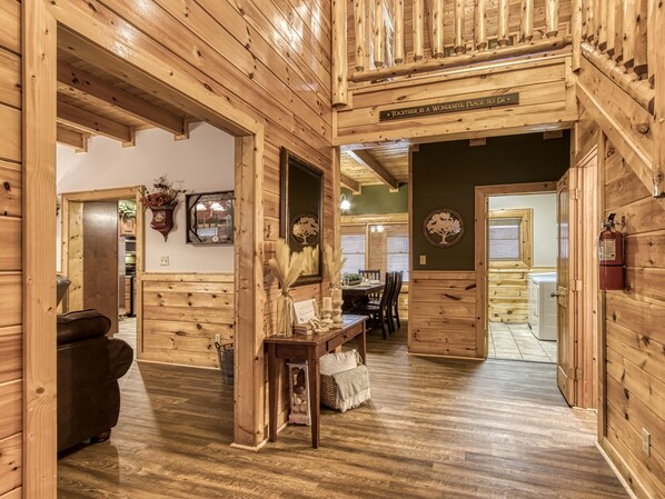 Disposition de la cabine: avec seulement 3 marches, le porche avant offre une balançoire en bois rond et des sièges supplémentaires. Entrez dans cette cabine dans un hall d'entrée de deux étages avec des plafonds de 22 pieds et une belle fenêtre en vitrail. À gauche du foyer, vous trouverez un salon avec une télévision à écran plat de 65 "avec service de câble, une cuisine entièrement équipée avec des appareils en acier inoxydable, un four double, une table de salle à manger ainsi que des sièges de bar. Hors de la salle à manger est une zone Den supplémentaire avec télévision à écran plat, des sièges, un baby-foot et une cheminée électrique. Hors de la tanière est l'accès à un pont arrière privé complet avec des sièges en bois rond, une balançoire en bois rond et un bain à remous bouillonnant. Par la cuisine, vous pouvez accéder à une pièce séparée qui abrite le théâtre / salle de jeux. Cette salle de cinéma est équipée d'une télévision connectée de 70 "et de 2 canapés confortables inclinables parfaits pour regarder votre film préféré ou votre équipe sportive. Aussi dans la salle de théâtre est une table de billard pour votre plaisir.