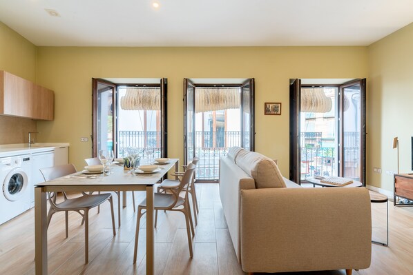 The living room has 3 small julienne balconies to the street. It is furnished with a sofa, coffee table and smart TV. Dining table with 4 chairs.