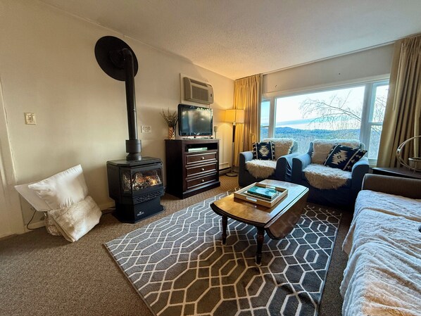 Relax by the cozy gas fireplace in the open floor plan living area, with cable TV and high-speed internet for staying connected – or games for unplugging and enjoying quality time. The spacious private deck provides stunning, ever-changing views of the surrounding landscape, perfect for enjoying Vermont’s beautiful seasons over morning coffee or evening relaxation. Ski and snowboard enthusiasts will appreciate the convenient storage space for gear in the entryway or on the deck.