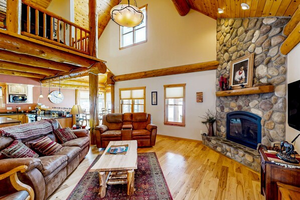 The living room is warmed by the heat of a stone-lined gas fireplace and has ample leather seating and a large smart TV. The adjacent chef's kitchen makes cooking a breeze with its large center island, granite countertops, and stainless steel appliances.