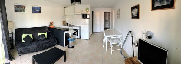 Dans le salon: 1 BZ 2 places (140), TV, table et 4 chaises.