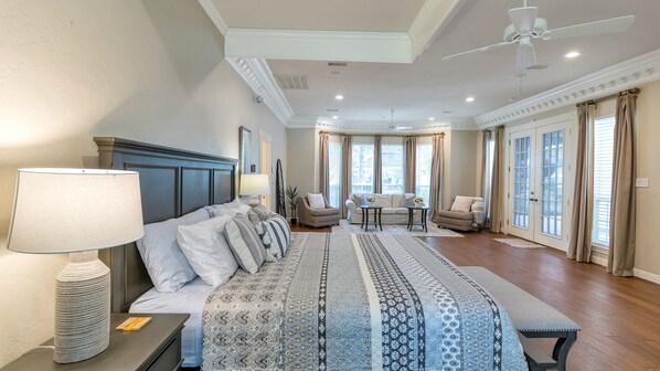 The HUGE primary bedroom is on the main floor with its own private exit to the gorgeous pool and Huge Patio. There is a comfortable king size bed and a sitting area with a sofa sleeper and 2 chairs. The bathroom offers plenty of space to get ready for a wedding or other special events. There is a jetted tub and a Large shower with double shower heads and a rain fall shower as well.