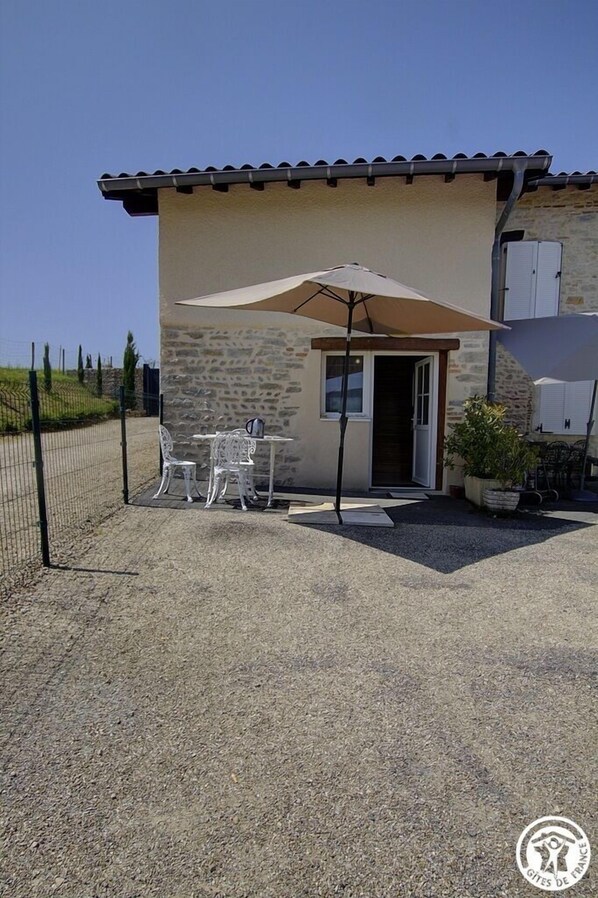 Au cœur du hameau le Mas Gruzin, dans une ancienne ferme Revermontoise, en pierre apparente, le gîte Bresse, sur 2 niveaux (61 m² au sol) vous accueille et est mitoyen à deux autres gîtes (6 et 4 personnes). L'entrée au rez-de-chaussée, se fait sur la cuisine équipée, ouverte sur le séjour. Une chambre (1 lit 160*200), WC indépendant. L'étage se compose d'une chambre (2 lits 90 à réunir si souhaité), un espace détente en sous pente avec velux, et un canapé convertible (clic-clac 1 personne). Une salle d'eau. Chauffage électrique et climatisation réversible. Petite terrasse privative avec salon de jardin. Un congélateur (avec 3 casiers) est mis à votre disposition dans un local technique de la grange semi-ouverte, avec une table de ping-pong, et contigüe au parking commun et clos. Une aire de jeux comprenant : une piscine hors-sol partagée avec les autres locataires ( et les propriétaires), accessible uniquement à la belle saison; toboggan et trampoline feront le bonheur des petits et des grands. Le remplissage de l'eau de la piscine et son usage par les locataires peuvent être restreints en application des arrêtés « sécheresse » de la préfecture de l'Ain .Le plus de ce gîte : charges comprises, draps fournis. Le gîte est idéalement situé à proximité de l'A40, Ainterexpo, Bourg-en-Bresse et son célèbre Monastère Royal de Brou, chef d'œuvre du gothique flamboyant et monument historique. Le Parc de Loisirs de Bouvent avec baignade, activités nautiques, aire de pique-nique avec barbecue, jeux pour enfants, snack et le golf homologué 9 trous. Sur place, le lavoir de la Chanaz, les randonnées pédestres et circuits VTT avec départ possible directement du gîte. Clientèle touristique et professionnelle.sont les bienvenues.