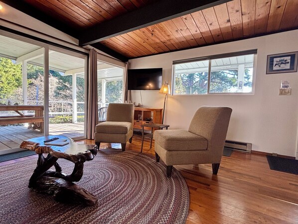 Cette maison est bien adaptée pour une escapade en couple, une réunion d'amis ou un séjour confortable pour une famille de quatre personnes. Il y a 2 lits Queen et un canapé-lit futon dans le salon. Parker Creek Cottage se trouve sur un très grand terrain avec beaucoup de cour pour profiter et est entièrement clôturé. Asseyez-vous et détendez-vous sur la terrasse couverte qui donne sur la forêt et le quartier. Cette maison a de beaux planchers de bois franc et de grandes fenêtres qui la rendent ouverte et chaleureuse. Le poêle à bois offre une chaleur et une ambiance exceptionnelles tout en regardant le câble T. V. sur le nouvel écran plat. Le salon est ouvert sur la cuisine bien équipée avec bar petit déjeuner. La table haute de style café ajoute une touche contemporaine. Le décor de style plage crée une atmosphère relaxante et une ambiance de chalet de plage amusant. Laveuse et sécheuse dans cabanon détaché.