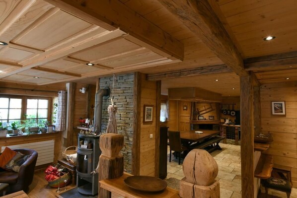 Un poêle à granulés est à disposition entre le salon et la cuisine, pour information, le chalet est chauffé par des radiateurs électriques, le poêle est un petit plus pour les flammes, les granulés ne sont pas fournis, pensez à apporter les vôtres.