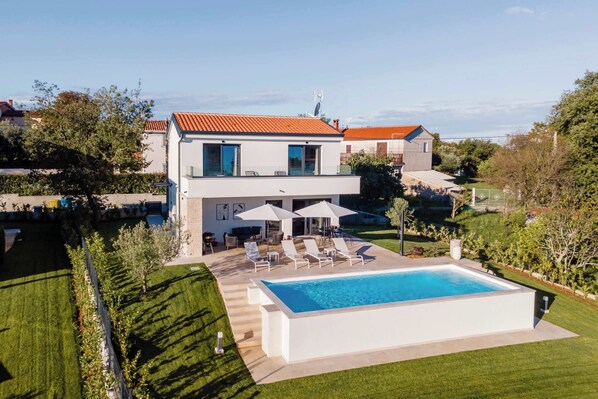 The villa sits on a spacious plot with an inviting (enclosed) garden and a generous terrace equipped with an outdoor dining table, a luxurious BBQ, a lounge area, poolside loungers, and a refreshing outdoor shower. The garden borders an olive grove – a typical Istrian setting that will instantly put you in holiday mode.