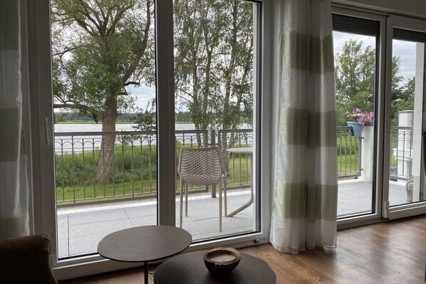 Dit appartement bevindt zich aan het meer en biedt onder andere een keuken en een balkon