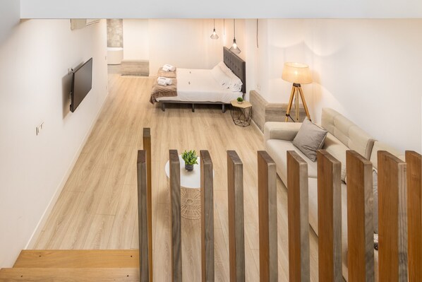 L'appartement consiste en un bel espace ouvert sur deux étages. Dès que vous entrez, vous trouvez la cuisine-salle à manger et après avoir descendu trois escaliers, vous avez un espace ouvert avec deux lits simples, un coin salon et une salle de bain. Cette dernière est équipée d'une baignoire et d'une douche.