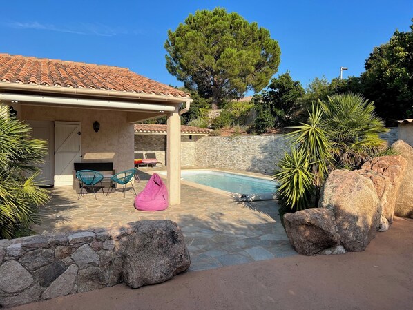 Vous aurez le choix de deux terrasses, une cuisine d’été, un barbecue et une plancha.