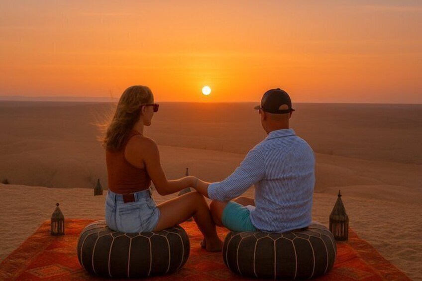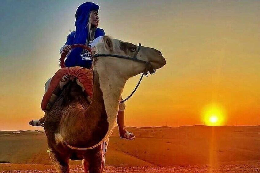 Balade à dos de chameau, dîner au coucher du soleil et spectacle de feu