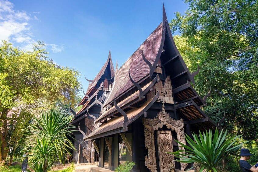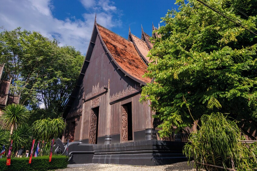 Stap na een heerlijke Thaise lunch binnen in de spookachtige schoonheid van het Black House Museum (Baan Dam), waar in donkere houten zalen botten, inheemse kunst en provocerende werken van Thawan Duchanee worden tentoongesteld. Mysterieus en onvergetelijk.