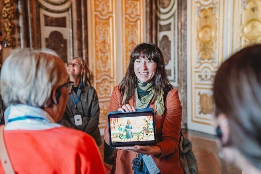 Na de picknick verkennen we het Château : State Rooms, King’s bedroom & Hall of Mirrors. We zijn er trots op een van de weinige tours te zijn die een vergunning hebben om binnen te Gids.