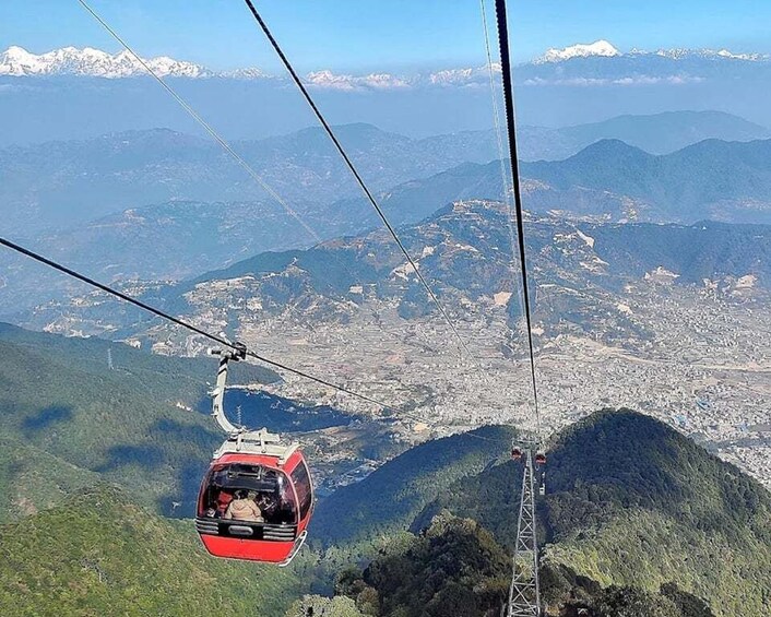 Commencez votre voyage par un confortable téléphérique qui vous emmène sans effort au sommet de la colline de Chandragiri, à 2 551 mètres (8 369 pieds) au-dessus du niveau de la mer. Aucune randonnée n'est nécessaire, il suffit de s'asseoir et de profiter de la balade en glissant à travers des forêts verdoyantes, tout en admirant des vues époustouflantes.