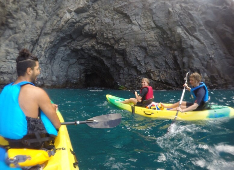 Voor deze kajaktour in de buurt van het strand van Los Cristianos hoef je alleen maar een zwembroek, handdoek, zonnebrandcrème en schone kleren mee te nemen; eerst krijg je al het materiaal dat je nodig hebt voor beide activiteiten, een deskundige gids geeft je een kleine training voordat je aan de activiteit begint en hij zal je gedurende de hele tour begeleiden en alles vastleggen met video's en foto's die met onze aquacamera's zijn gemaakt, foto's die we gratis naar alle deelnemers sturen.