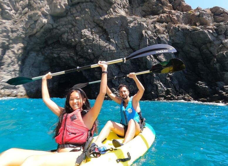 Nadat we de snorkelspullen hebben voorbereid. We snorkelen rond deze grotten waar we verschillende soorten vissen en schildpadden kunnen zien, ongetwijfeld een van de meest adembenemende onderdelen van deze kajaktocht. Als we genoeg genoten hebben, stappen we weer op de kajaks en gaan we verder met het verkennen van de kust op zoek naar de vrijzwemmende dolfijnen en rode krabben die langs de kust leven, het zal de beste manier zijn om deze kajakexcursie af te sluiten.