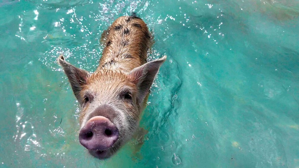 Ga eerst naar het water en ontmoet de wereldberoemde zwemmende varkens! Voer, aai en fotografeer om de beurt onvergetelijke momenten met deze speelse dieren in het ondiepe, kristalheldere water.
