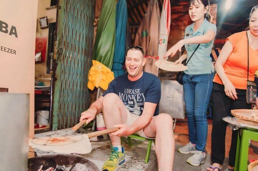 - Ons menu met 12 proeverijen: 1. Bun Bo Hue - Rundvleesnoedelsoep 2. Gegrilde oester met zwarte pepersaus 3. Gegrilde bananen gewikkeld in kleefrijst en gedrenkt in kokosmelk 4. Banh Xeo - Hartige knapperige pannenkoek met garnalen 5. Rijstnoedels salade met BBQ (rundvlees gewikkeld in betelblad), groenten en speciale dipsaus 6. Bananenkraker 7. Banh Mi Saigon 8. Jasmijnthee 9. Saigon Bier 10. Verse loempia met garnalen 11. Koud suikerrietsap met Kumquat 12. Vlaaicake als dessert