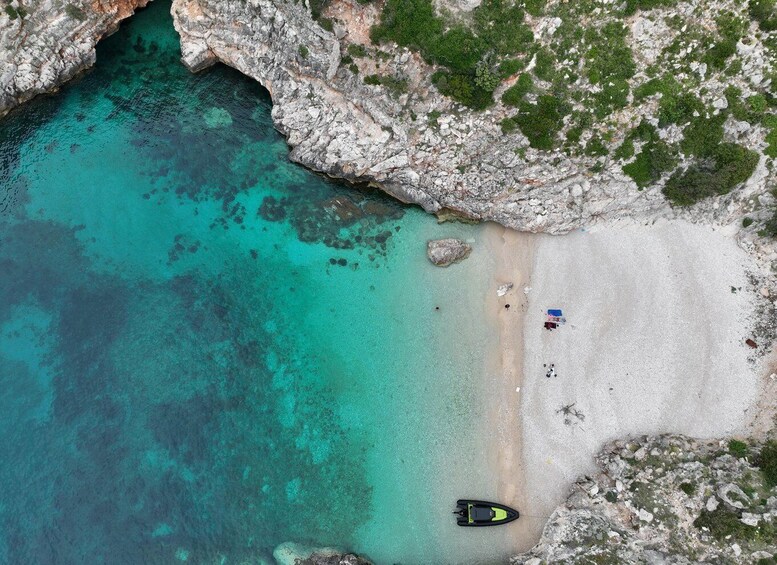 Nous visitons d'abord la grotte de Haxhi Ali. Le trajet jusqu'à la grotte dure environ 30-40 minutes, nous entrons dans la grotte où nous restons environ 20 minutes pendant lesquelles vous pouvez nager, faire du snorkeling et admirer la magnifique nature sauvage de la grotte pleine de couleurs et le monde sous-marin coloré.